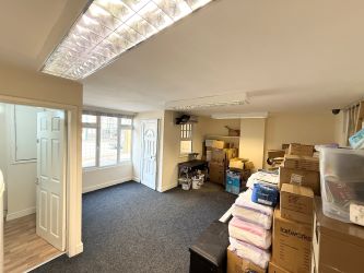 A UPVC front door and window is located behind the electric roller shutter and inside partition walls have created a porch, a reception area and two further office rooms. There is a kitchen area and private WC.