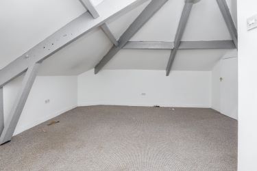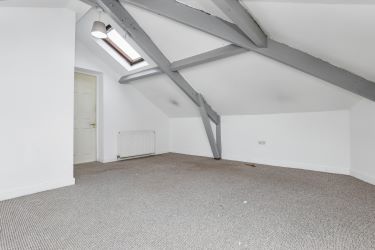 -Second Floor: Large double bedroom (4.91m x 4.97m) with exposed beams and Velux window, plus an en-suite bathroom (1.83m x 2.36m).
