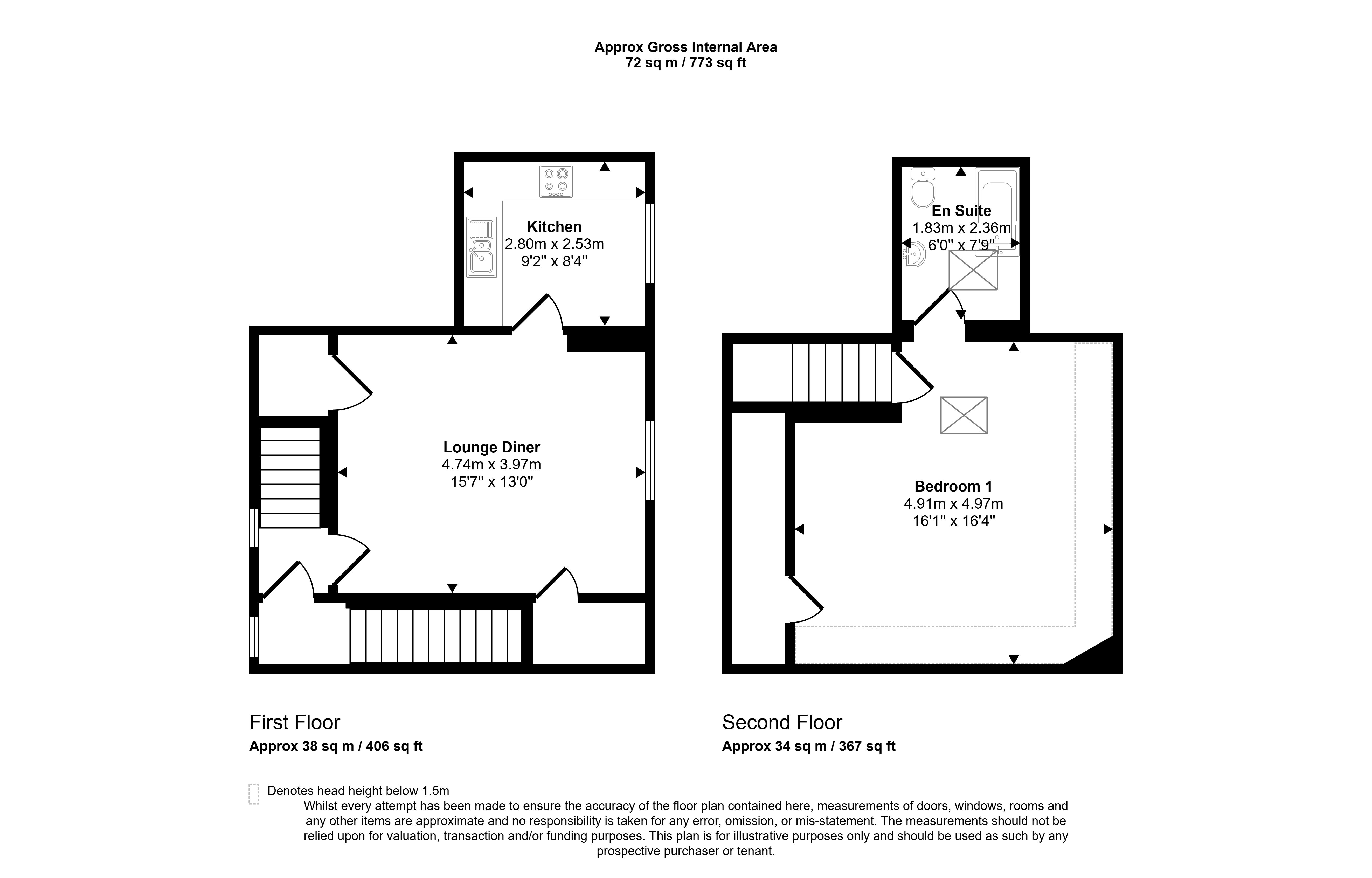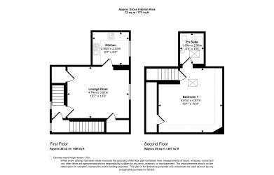 -First Floor: Private entrance with stairs leading to a generous lounge/diner (4.74m x 3.97m) and fitted kitchen (2.80m x 2.53m).