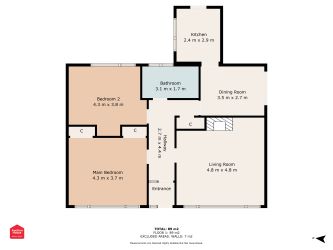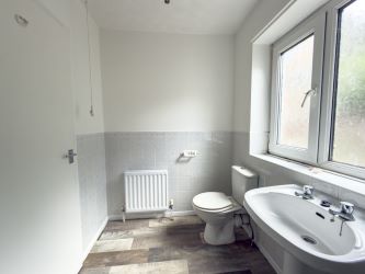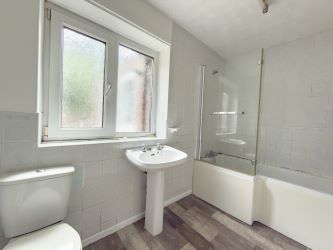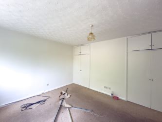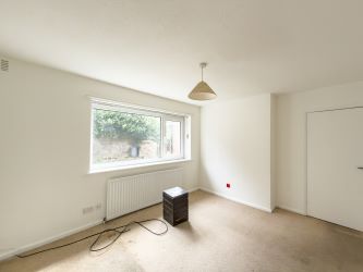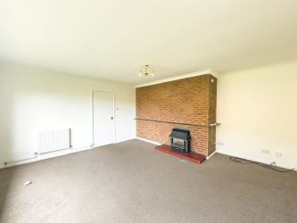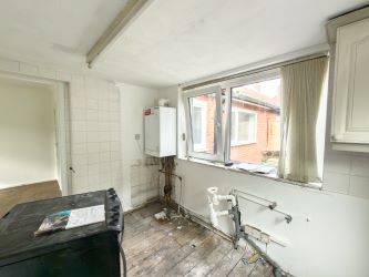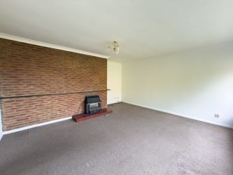 Internally, the accommodation comprises a welcoming entrance hallway leading to a bright and airy living room with feature brick wall, a separate dining room with garden access, and a kitchen in need of updating but with scope to design a modern cooking space. The property offers two generously sized double bedrooms—both with fitted storage—and a family bathroom with three-piece suite.