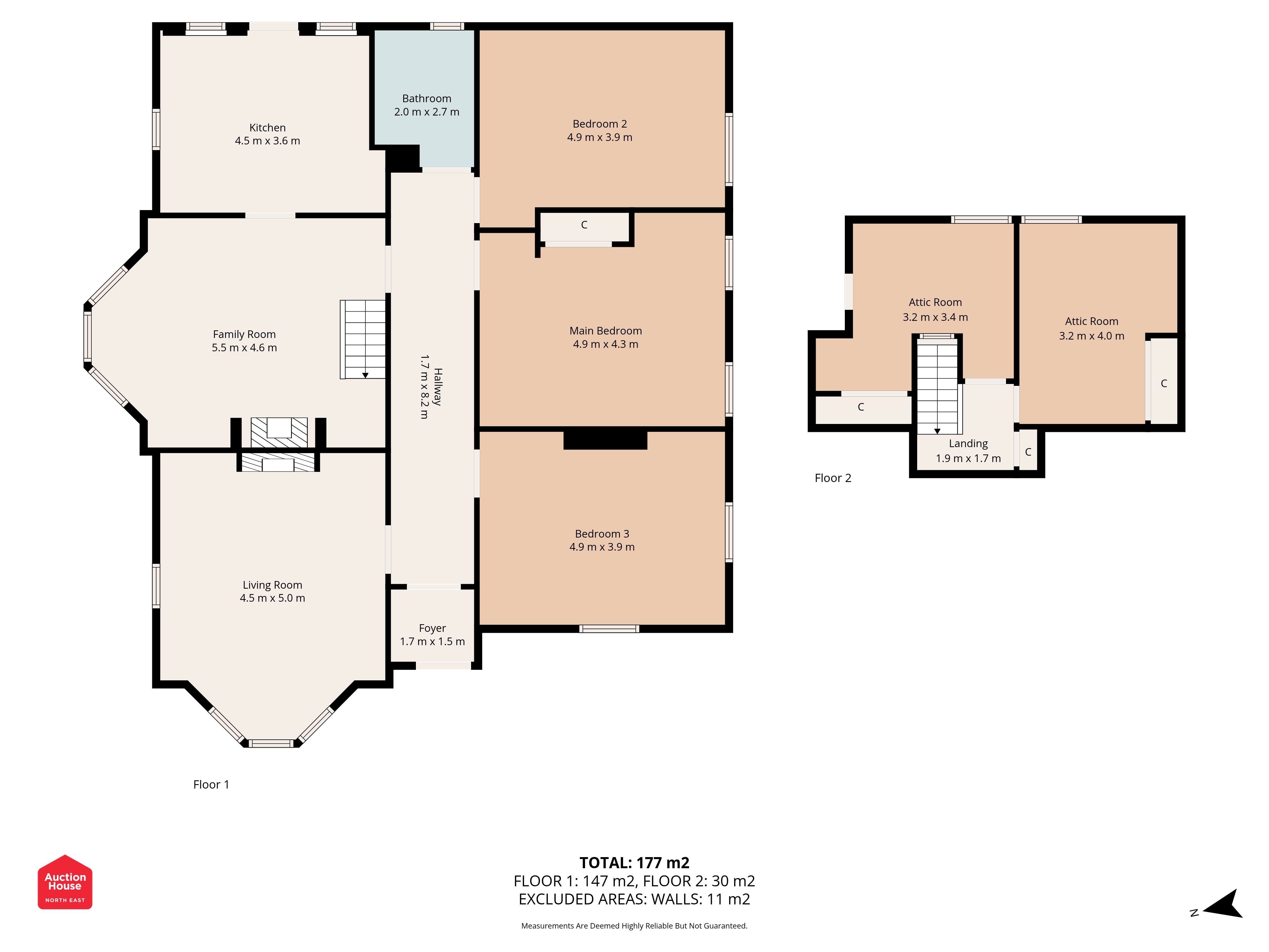 On the ground floor, the accommodation includes a large living room with a log burner, a separate sitting room with bay windows, a fitted kitchen, three well proportioned bedrooms, and a fitted bathroom. The upper floor provides two additional attic rooms, offering flexible use as bedrooms, home office, or hobby spaces.
