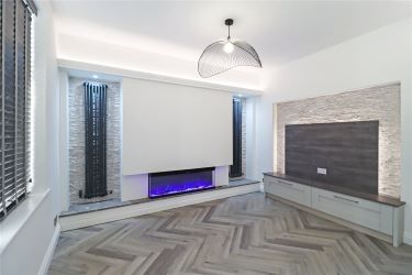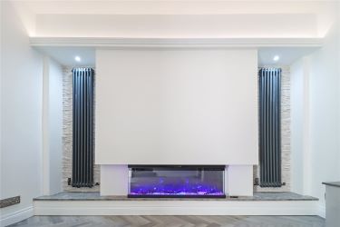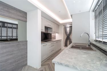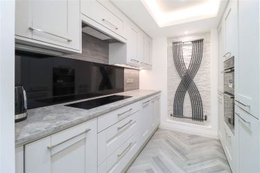 -Contemporary fitted kitchen with integrated appliances & feature radiator wall