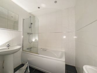 -Bathroom (approx. 2.1m x 2.2m) — fitted with white suite including bath with shower over, pedestal wash hand basin and WC.