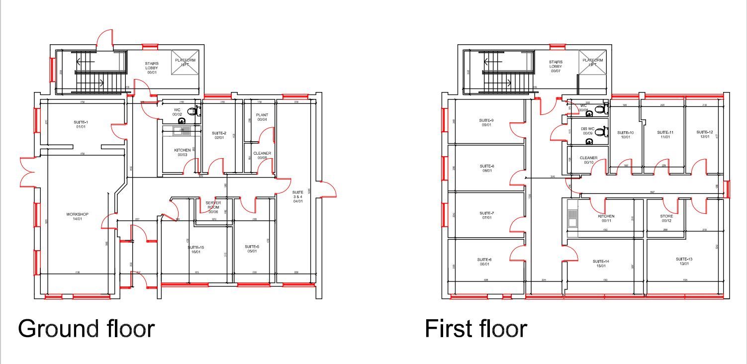 -First Floor: Multiple office suites, store room, kitchen, and accessible WC.