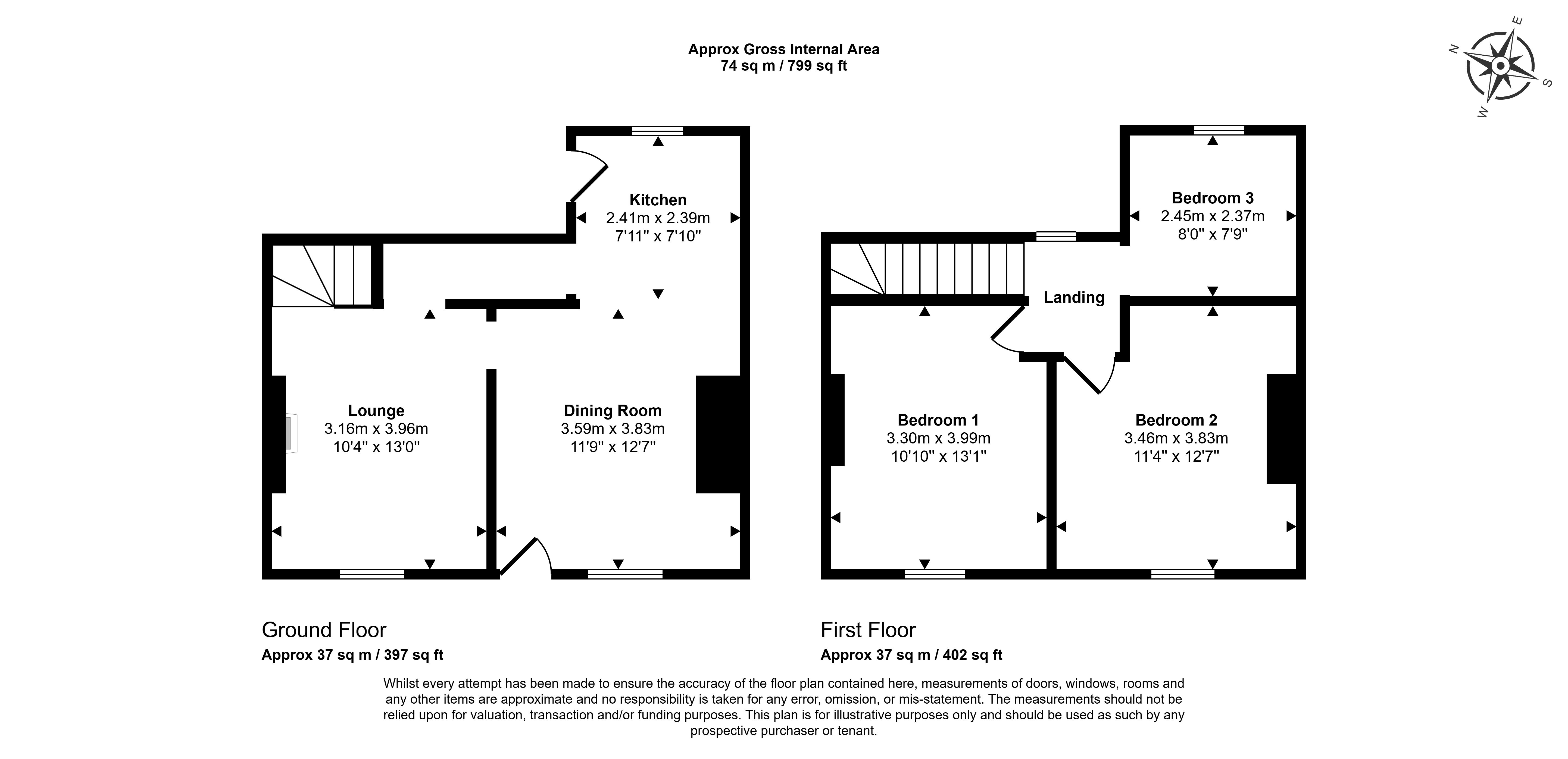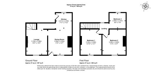The accommodation is arranged over two floors and extends to approximately 74 sq. m. (799 sq. ft.). The ground floor comprises two well-proportioned reception rooms and a kitchen, while the first floor offers three bedrooms.