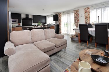 Upon entering the property through the front door, you are welcomed into a generously sized open-plan kitchen and living area. The kitchen is well-equipped with ample cupboard space and work surfaces. The adjoining living room provides a warm and inviting space with plenty of room for a full suite of furniture. Ideal for both relaxing and entertaining guests. Large windows allow for natural light and offer beautiful views over the surrounding farmland.