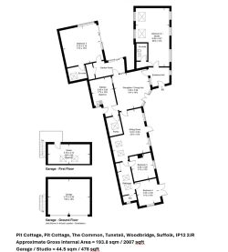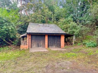 Outside, a private driveway leads to a detached double garage with studio above, as well as providing ample parking. The gardens, about an acre in total (stms), are mainly lawn with wild areas, a paved terrace, timber outbuildings, and a greenhouse.