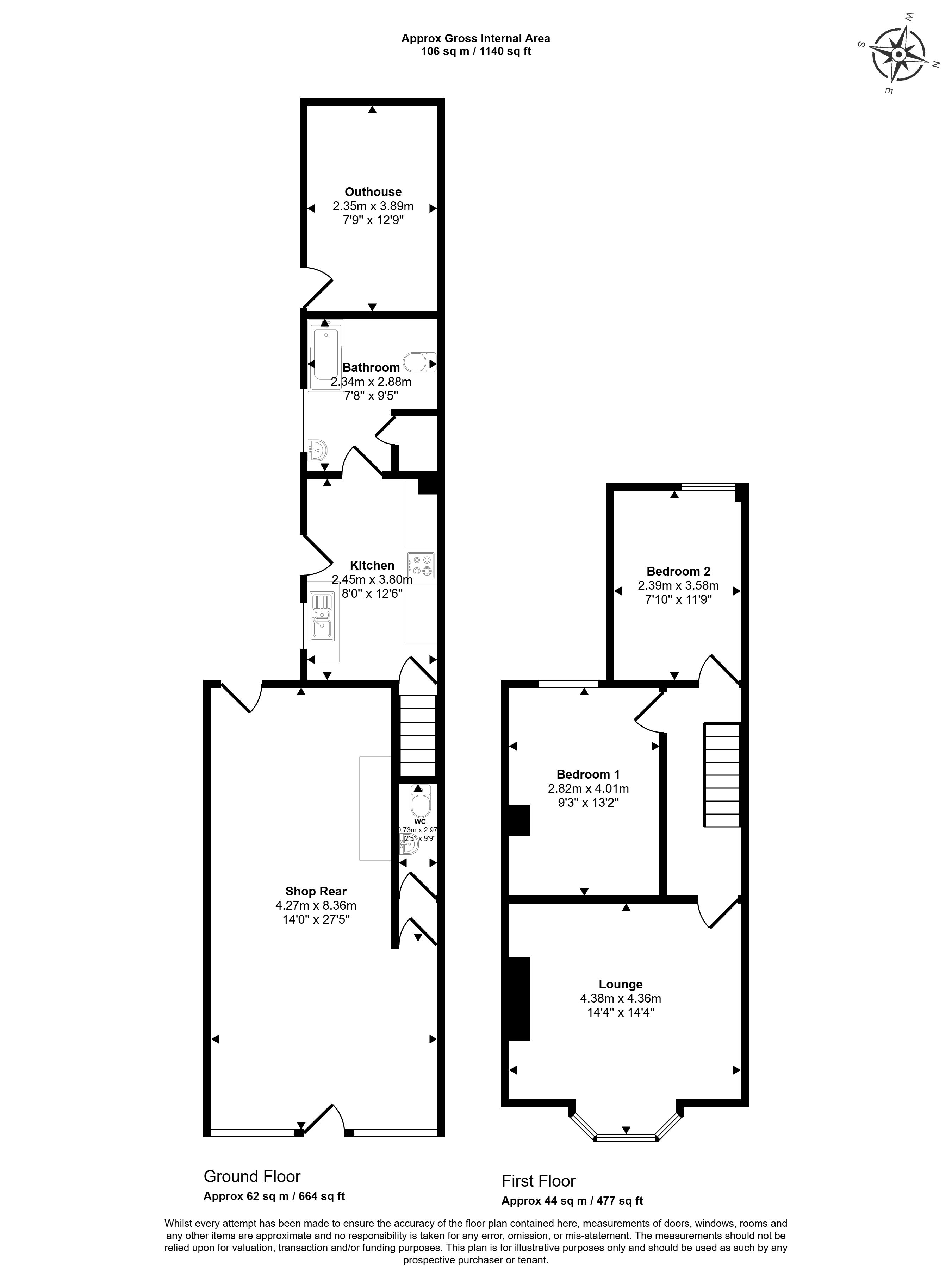 This property comprises downstairs of a shopfloor/café space with a w.c. Also on the ground floor is a separate entry to the flat, which has a kitchen and bathroom on the ground floor as well as two bedrooms (or three bedrooms and a lounge) to the first floor. To the outside is a yard area and an outhouse.