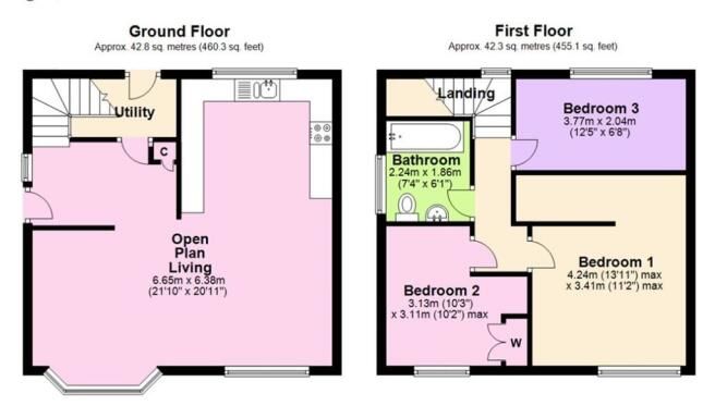 The accommodation is arranged over two floors and comprises an open-plan living and kitchen area with a separate utility room to the ground floor. To the first floor are three bedrooms and a family bathroom. Externally, the property benefits from an extensive gravelled frontage and side area, providing ample off-street parking potential or outdoor space, all enclosed by modern timber fencing.