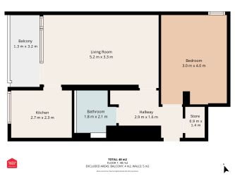 The accommodation briefly comprises: entrance hallway with storage, a spacious living room (5.2m x 3.3m) with access to the balcony, kitchen, double bedroom (3.0m x 4.0m) with fitted wardrobes, and a three-piece bathroom suite. Externally, the development features maintained communal grounds and parking areas.