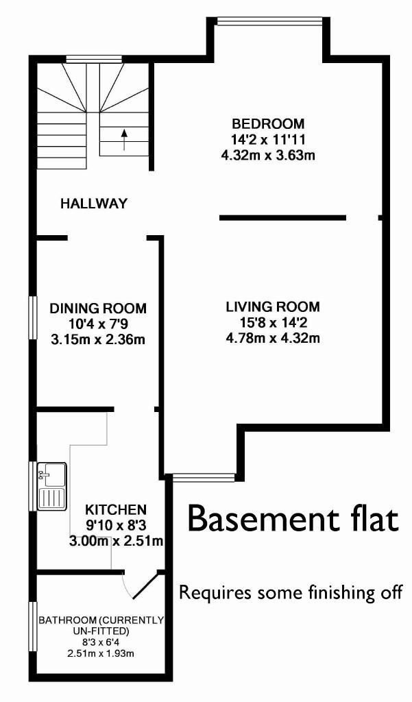 Basement Flat Hallway, dining room, kitchen, living room, bedroom, bathroom (un-fitted)
