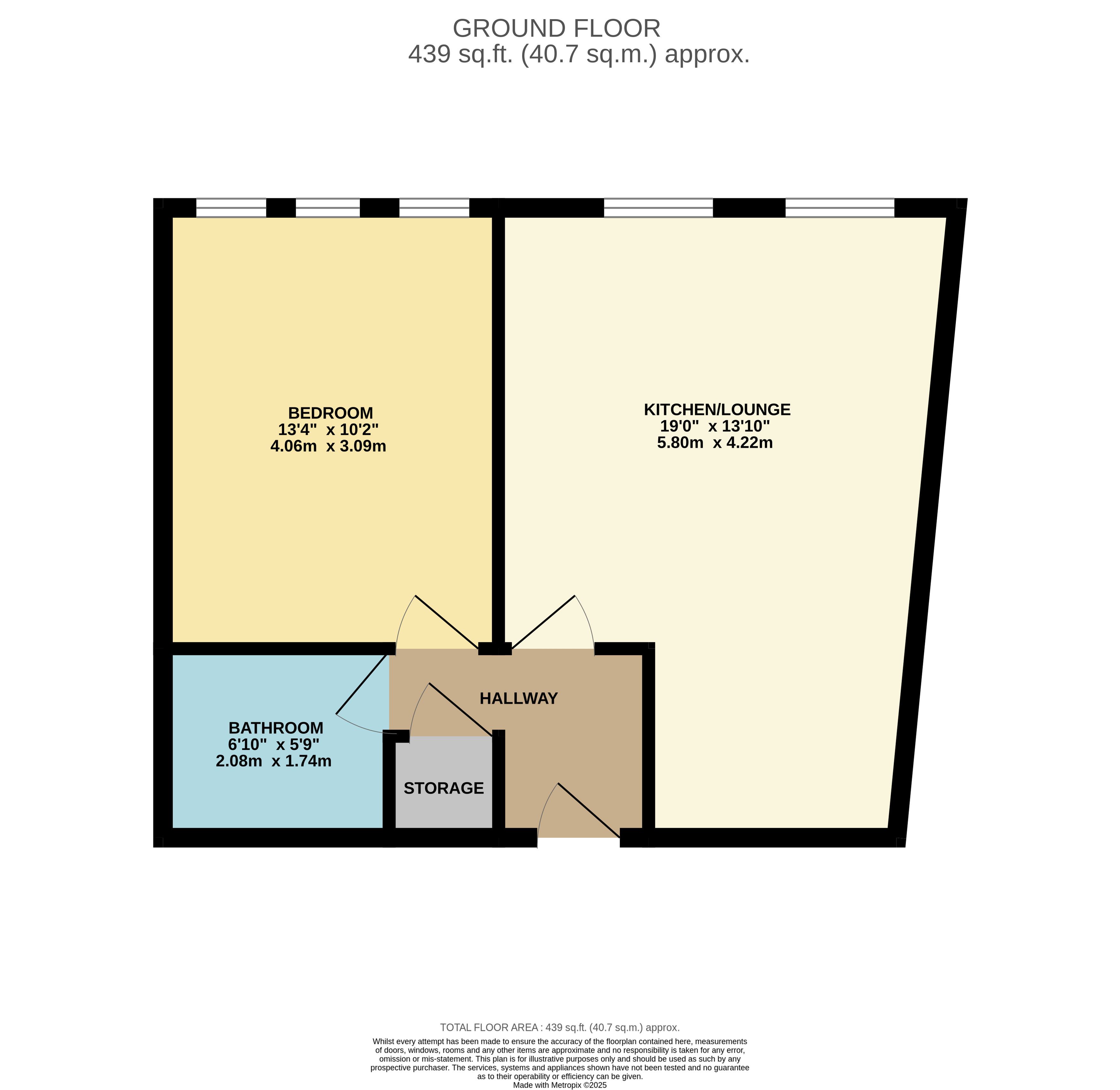 Comprising of an entrance hallway with storage cupboard leading to a lounge/kitchen, bedroom and a bathroom.