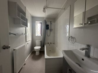 -Family Bathroom — White suite with bath and shower over, washbasin, and WC.