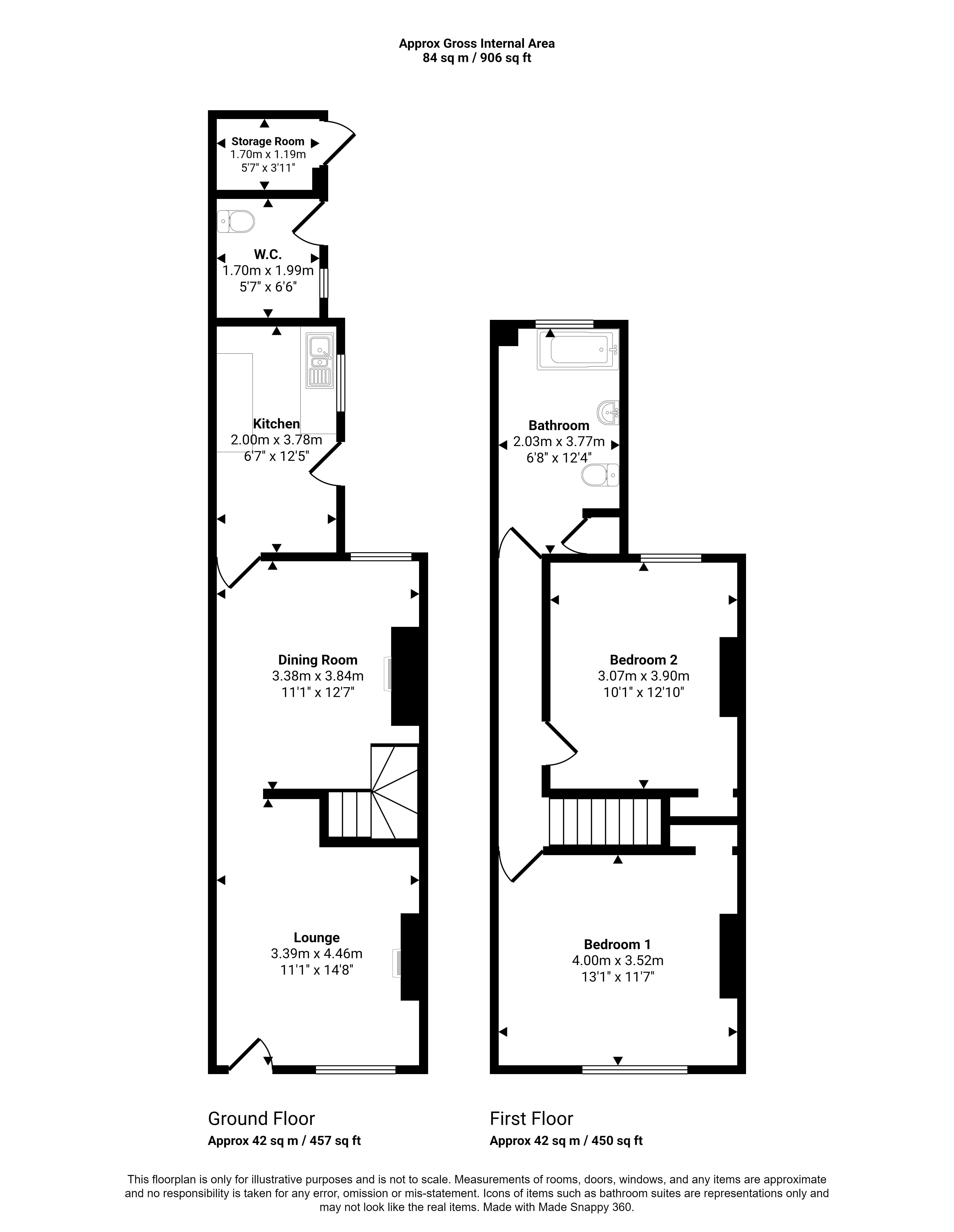Ground Floor Lounge 4.46m x 3.39m, Dining Room 3.38m x 3.84m, Kitchen 3.78m x 2.00m. Store 1.70m x 1.19m, WC 1.70m x 1.99m