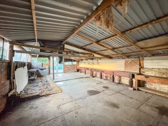 Front buffer garden and enclosed rear garden with substantial workshop space.