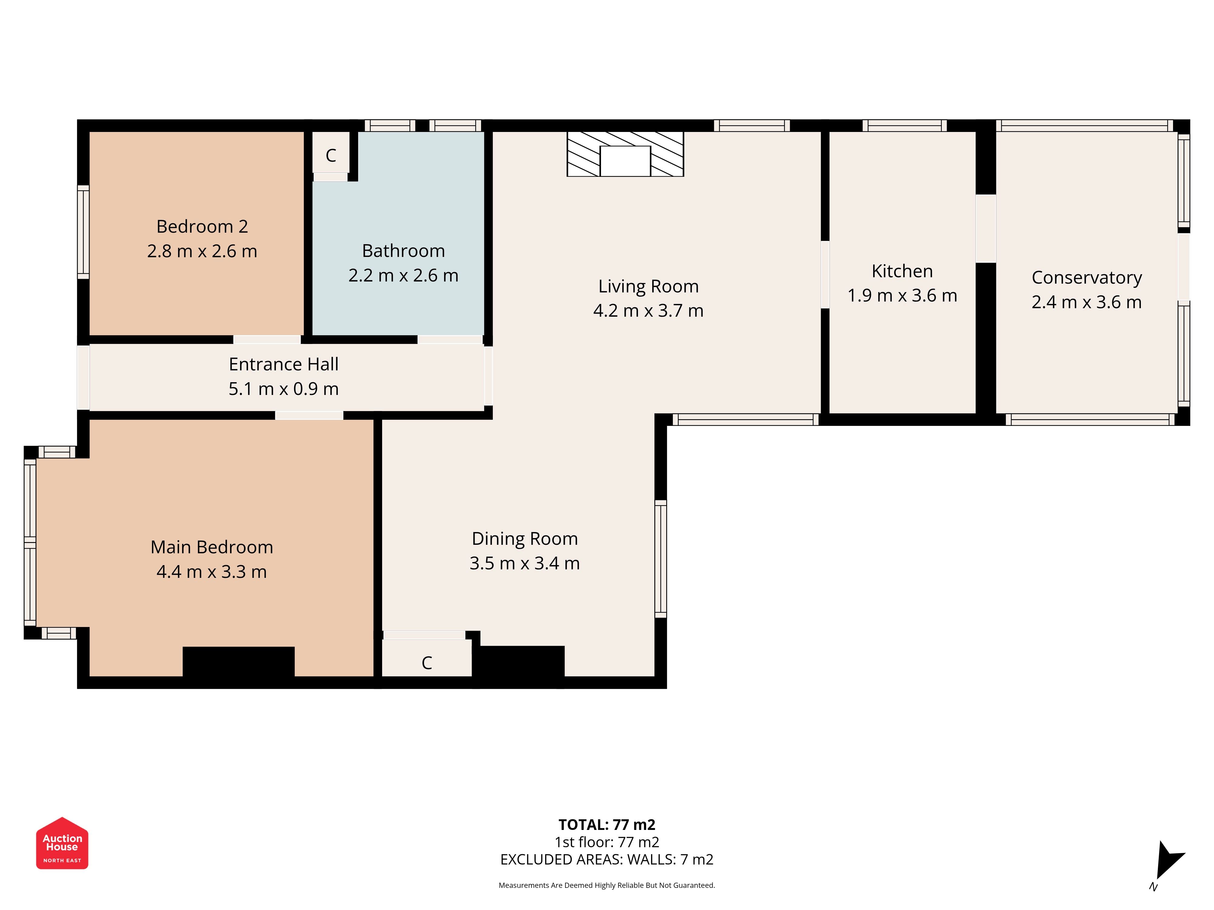 The accommodation extends to approximately 77 sq m (829 sq ft) and briefly comprises: entrance hall, spacious living room, separate dining room, kitchen, conservatory, two bedrooms and a bathroom. Externally, the property benefits from front and side gardens, a gated driveway and further outdoor space with potential for landscaping or extension (subject to the necessary consents).
