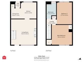 Landing, two well-proportioned bedrooms (main bedroom approx. 3.6m x 3.6m, second bedroom approx. 2.7m x 3.9m) and a family bathroom.
