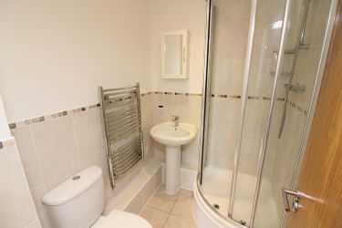 En-suite A white suite comprising a fully tiled shower cubicle with shower, pedestal wash hand basin and low level WC. Shaver point