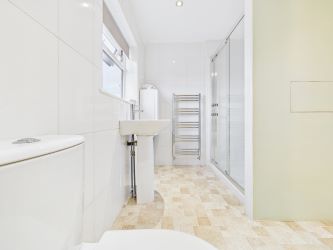 Walk-in shower, low-level W/C, pedestal wash hand basin, chrome radiator. Combi-boiler. Window to the front.
