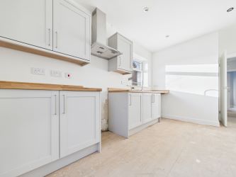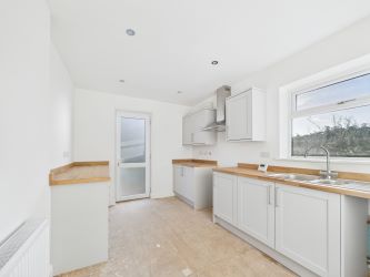 Range of shaker style wall and base units. Space for three appliances. Space for cooker with extractor fan above. Stainless steel sink. Door to rear garden.