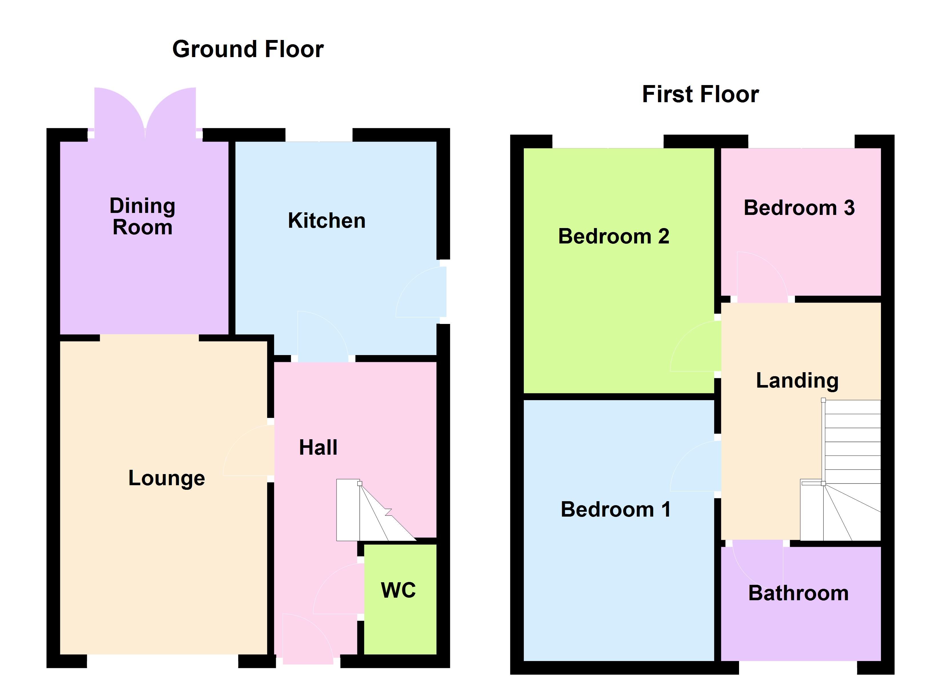 Ground Floor Front Door leads to Entrance Hall with stairs to first floor off and access to W.C., Door to Lounge 4.7m x 3.1m, access to Dining Room 2.9m x 2.5m with French Doors to rear garden. Kitchen 2.9m x 3.2m max with door to outside.