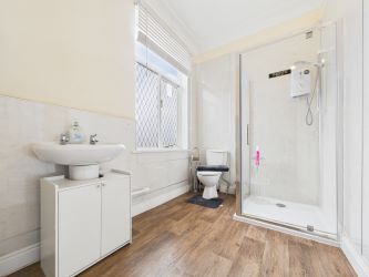 Three piece bathroom suite comprising:- low flush WC, sink with pedestal, shower, chrome radiator. Window to rear.