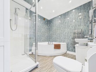Bathroom suite comprising:- low flush WC, sink with pedestal, shower, corner bath, chrome radiator. Window to side elevation.
