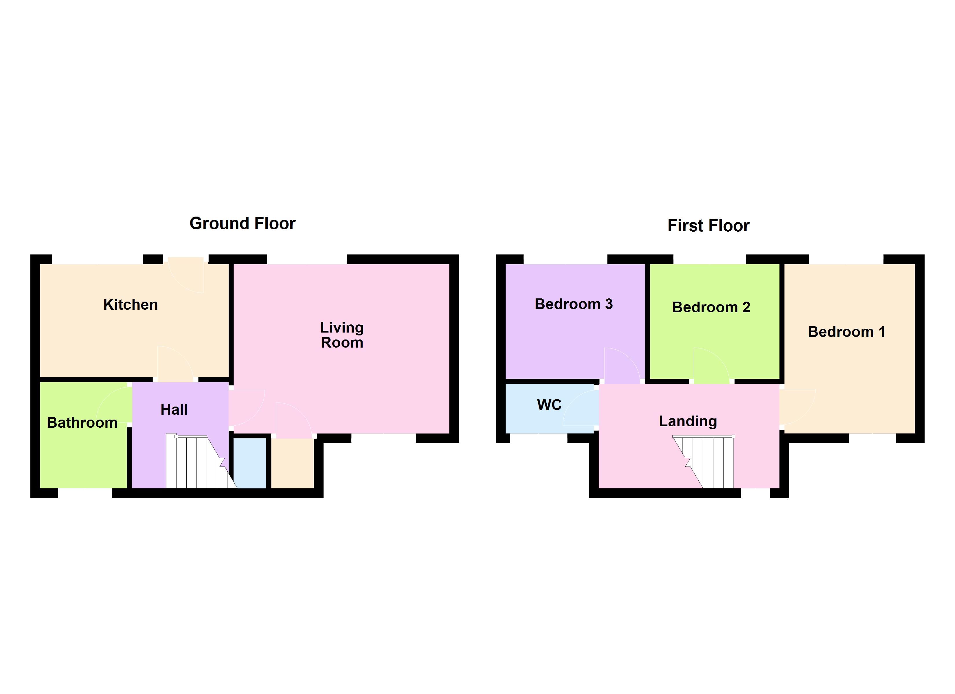 First Floor Staircase to Landing giving access to Bedroom One (front) 3.6m x 3m, Bedroom Two (rear) 2.6m x 3m, Bedroom Three (rear) 2.6m x 3m, W.C.