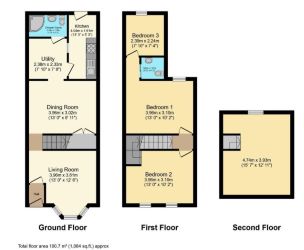 The accommodation includes a bay-fronted living room, dining room, kitchen, utility area and bathroom on the ground floor. The first floor offers two/three bedrooms and a separate WC, with stairs leading to a loft room on the second floor. Externally, the property benefits from a rear garden featuring a covered patio area and a shed.