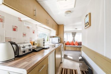 Static caravan Located in the back garden offering two bedroom, sitting room, kitchen and shower room.