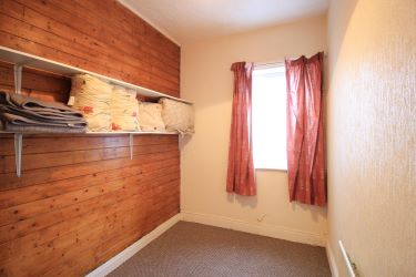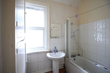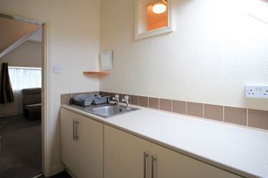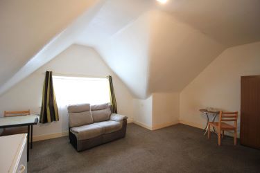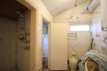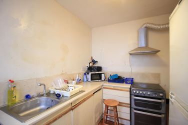 The top floor consists of a single room with a sitting area, a kitchen with fitted units and worktop, and a bathroom with bath and WC. Light is provided by a Velux-style skylight. This floor has a fire door, its own electric card meter, and a small landing with built-in storage cupboards and lighting. (There is no gas central heating radiator on this level.) Stairs lead down to the second floor.