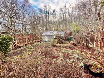 Gate into rear enclosed garden with shed, greenhouse and a wooded back-drop.