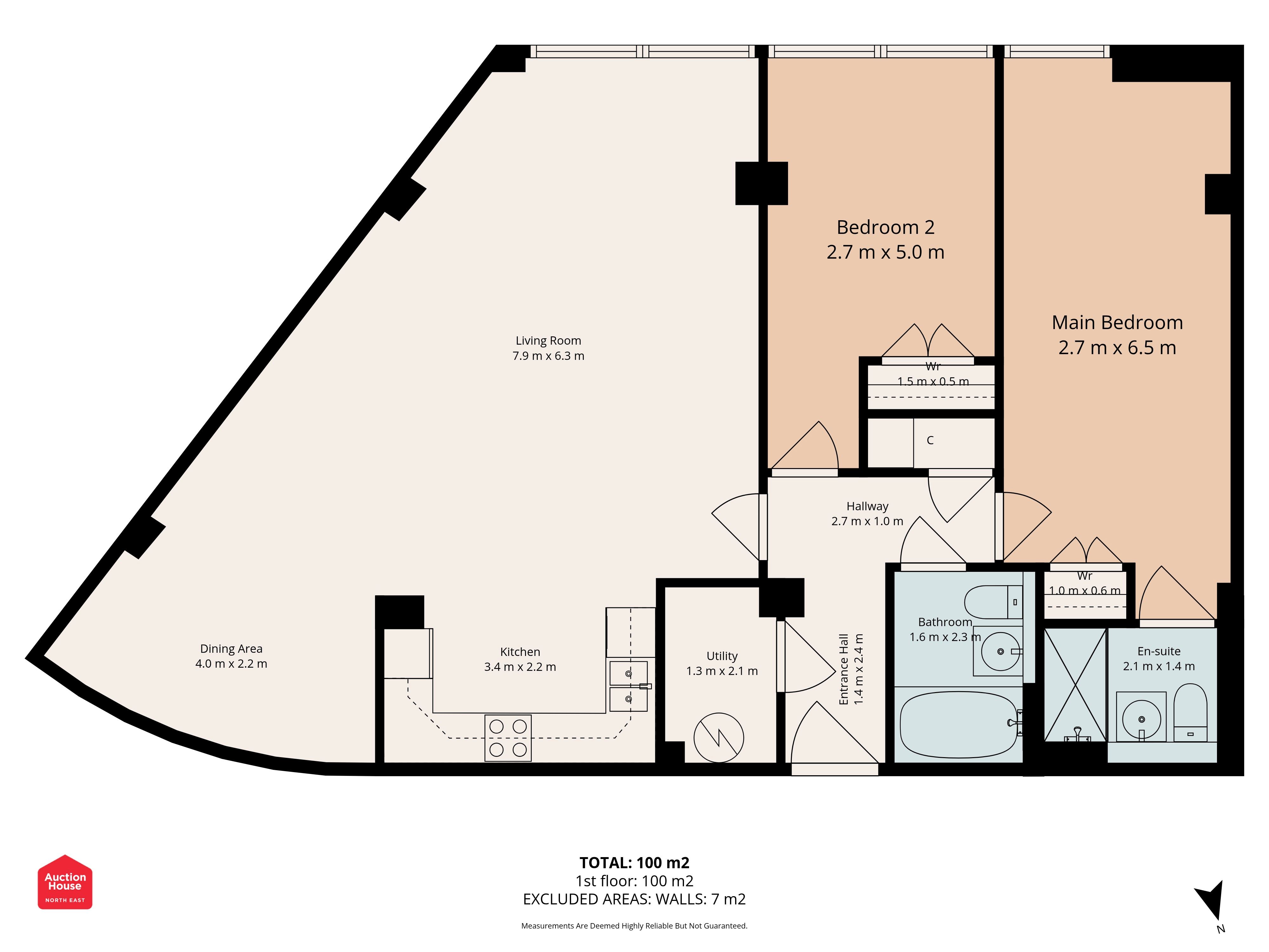 The property extends to approximately 100 m², offering well-balanced and flexible living accommodation.