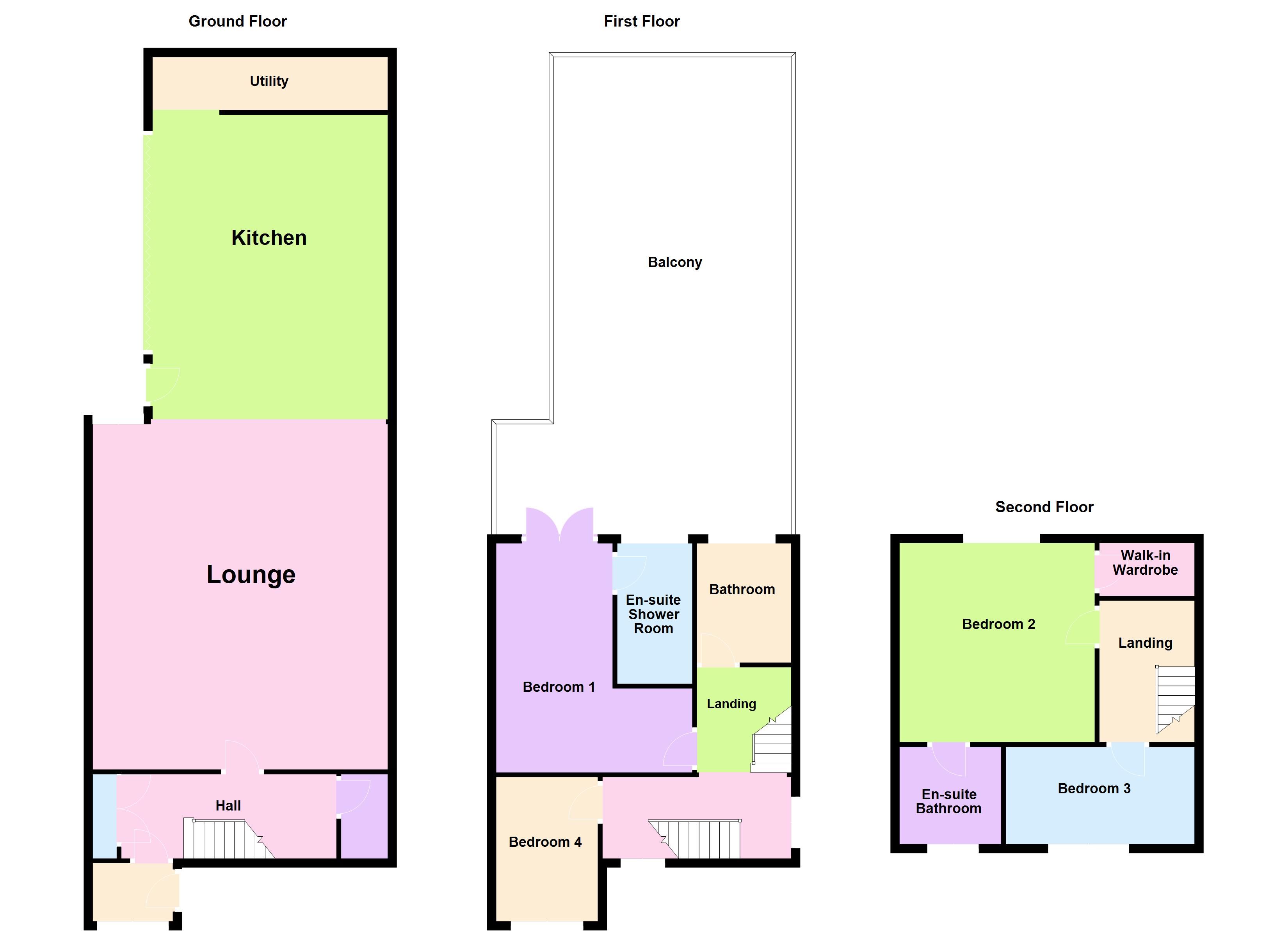 First Floor Staircase leads to Landing having access to Bedroom Two 3.7m max x 5m with door leading onto large balcony, En-Suite Shower Room, Bedroom Four 3m x 2.4m, Family Bathroom.