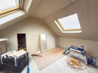 Internally, the property is in a partially refurbished condition, with works including structural alterations, plasterboarding, and first-fix elements already in place. The loft conversion is well advanced, and materials such as a sauna unit are included within the sale. However, the property requires completion throughout, making it ideal for those looking to add value.