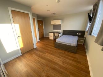 Located on an upper floor, the property offers modern, self-contained accommodation comprising an open-plan living/sleeping area with fitted kitchenette, a private shower room, and built-in storage. The apartment benefits from good natural light and is finished to a contemporary standard throughout.