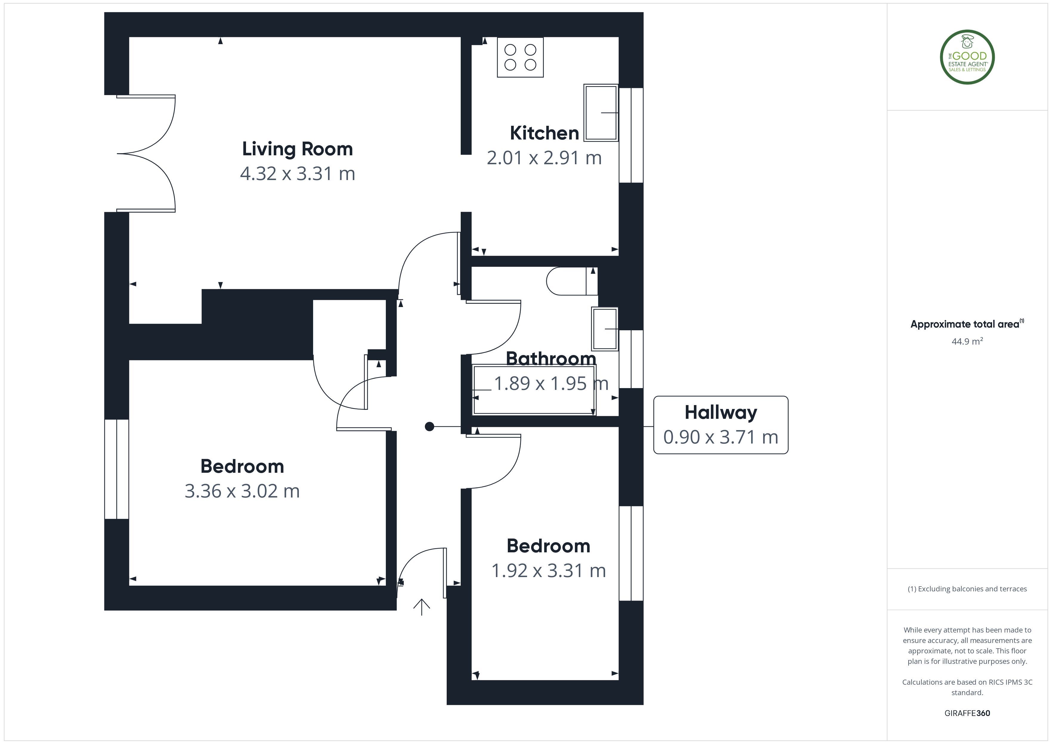 The accommodation briefly comprises: communal entrance, private hallway, spacious living room, fitted kitchen with appliances, two bedrooms, and a bathroom suite. Externally, there are communal grounds and access areas.
