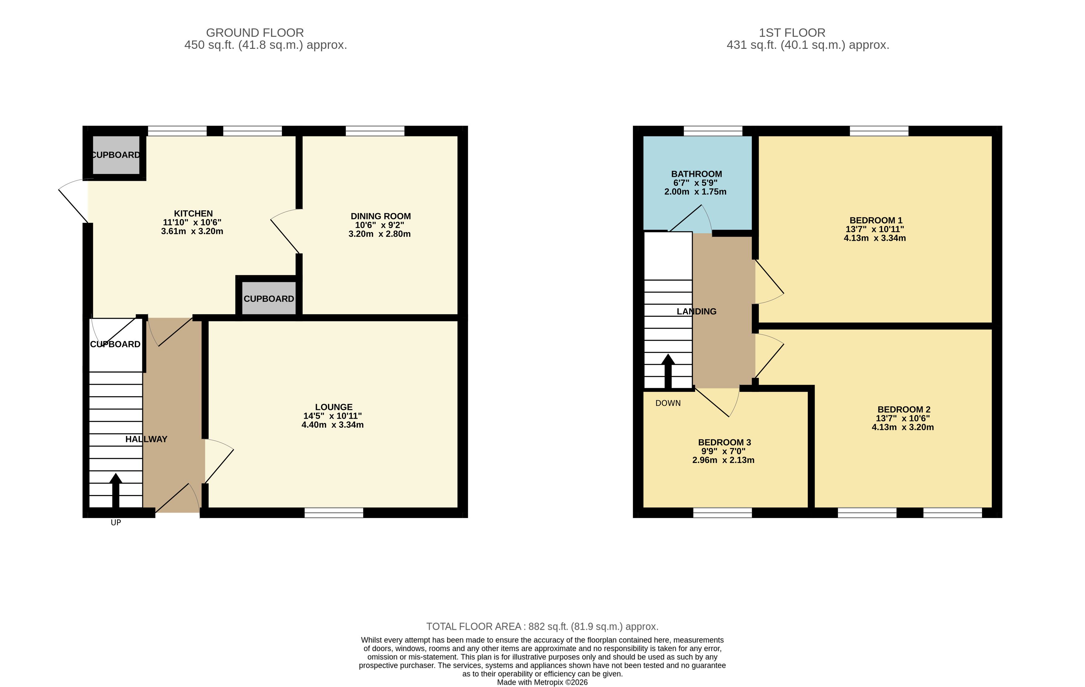 The property provides approximately 882 sq ft of accommodation arranged over two floors. To the ground floor, there is an entrance hallway leading to a spacious lounge with front-facing windows, a separate dining room, and a good-sized kitchen with access to the rear. The layout offers scope to reconfigure into a modern open-plan kitchen/diner if desired (subject to necessary consents).