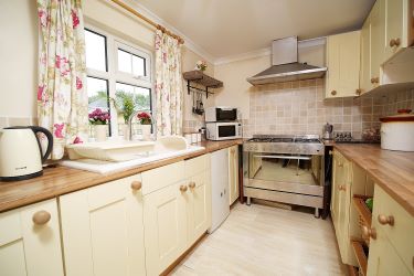 Fitted with a range of wall and base units with co-ordinating worktops, free standing cooking range, with extractor hood above, sink and drainer with mixer tap, spaces for appliances. Ceiling light point, radiator, part wall tiled