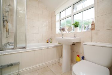 Fitted with a three piece white suite comprises: panelled bath with over bath shower, pedestal wash hand basin, low level w.c. Ceiling light point, fully wall tiled, radiator.