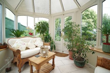 Timber conservatory, tiled flooring, french doors leading to rear garden