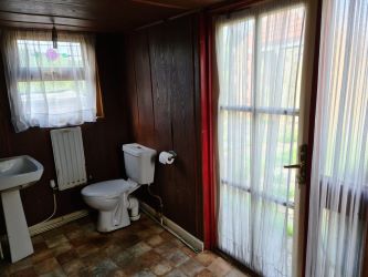 3.29m x 1.41m (10’9 x 4’7) pedestal wash basin, low flush w.c., plumbing for automatic washing machine, panelled walls, double glazed window and door unit.