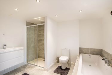 uPVC double glazed frosted window to the side aspect, four piece bath suite briefly comprising of low level w.c., pedestal wash hand basin, corner bath and shower cubicle, tiled floor and radiator.