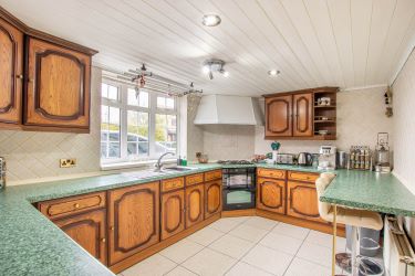 uPVC double glazed bay window to the front aspect, a range of base and wall storage units, four ring gas hob with electric oven and extractor over, integral fridge, one and a half bowl sink and drainer unit, tiled floor, breakfast bar and radiator.
