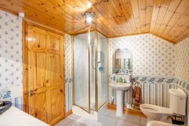 uPVC double glazed bay window to front aspect, low level w.c, pedestal wash hand basin, separate shower cubicle and door leading through to walk in wardrobe.