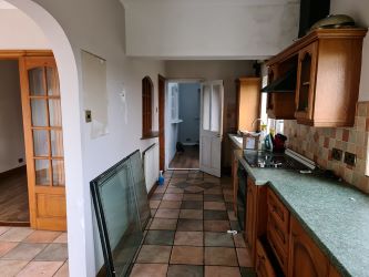uPVC double glazed windows to side elevation, range of fitted floor and wall units with complementary rolled edge work surfaces, tiled splash and inset electric oven, hob and extractor, one and a half bowl sink and drainer unit, space and provision for automatic washing machine, fridge freezer and tumble dryer. Fully tiled floor, two radiators. Archway to: