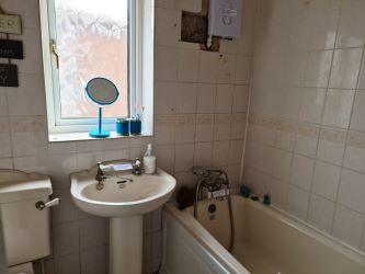 With fully tiled walls and floor, uPVC double glazed opaque glass window to the side elevation, radiator, low level flush w.c., pedestal wash hand basin and panelled bath.