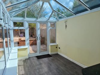 uPVC double glazed windows throughout and uPVC double glazed roof. Double doors opening to the rear garden. Spotlights to ceiling.