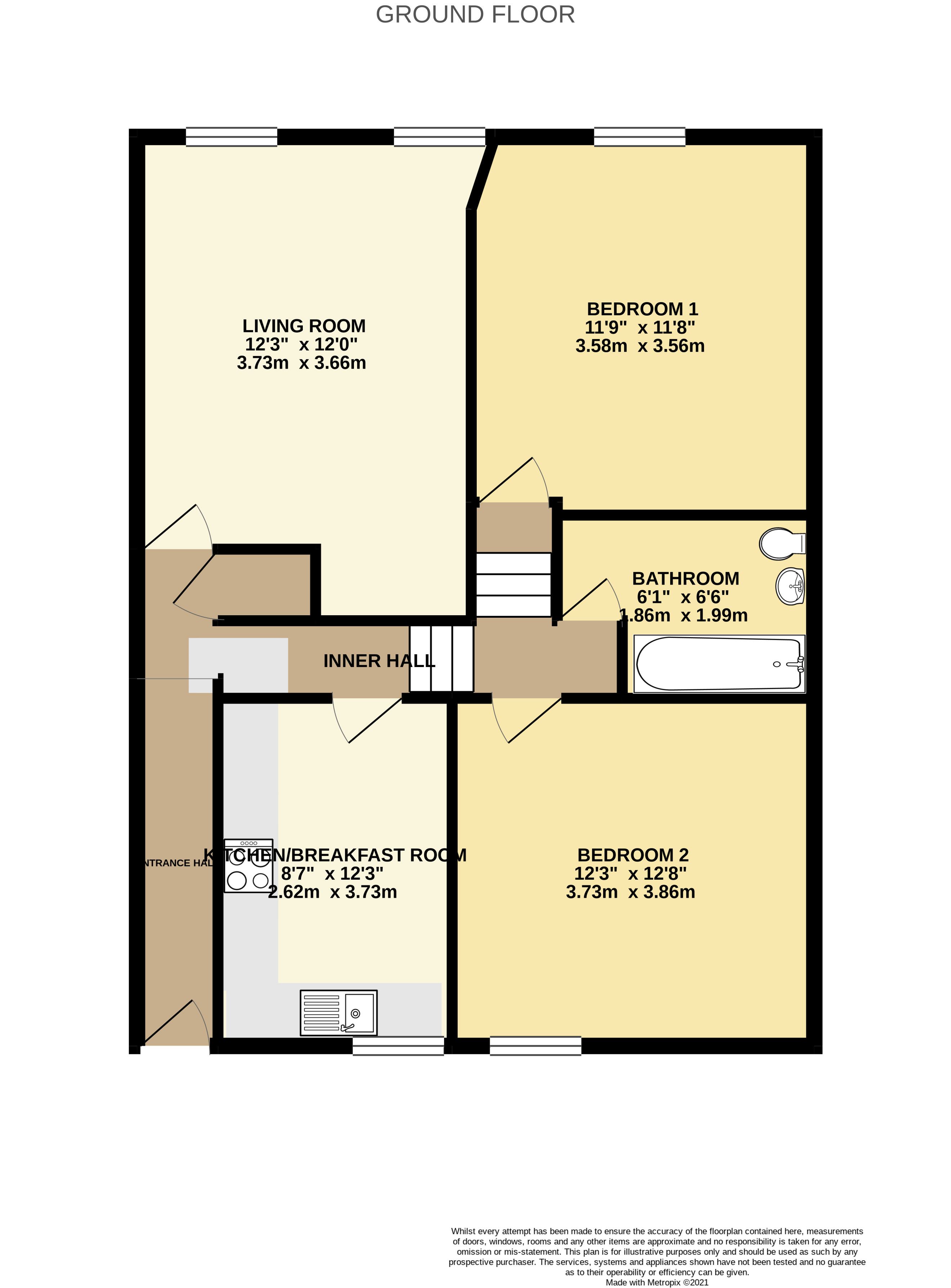 Entrance hall, sitting room, kitchen, two double bedrooms, bathroom