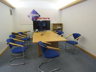Suspended ceiling with up-lighters and central heating radiator, numerous data and power sockets.